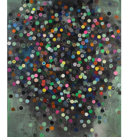 Acrylic, oil, spray paint, printing ink,